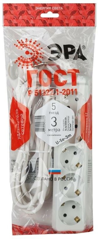 10 цен на Удлинитель электрический U-5e-3m-3x1.5 с заземлением 5 розеток 3м ПВС 3х1.5кв.мм 16А | код.Б0044038 | Эра (6шт.в упак.)