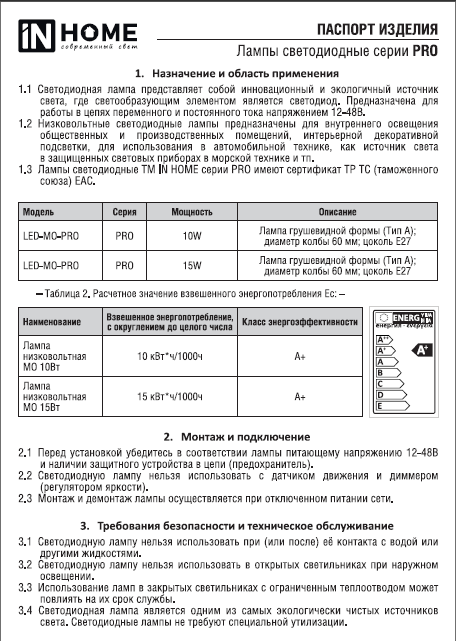 Лампа светодиодная низковольтная LED-MO-PRO 10Вт 12-48В Е27 4000К 900Лм IN HOME информация: