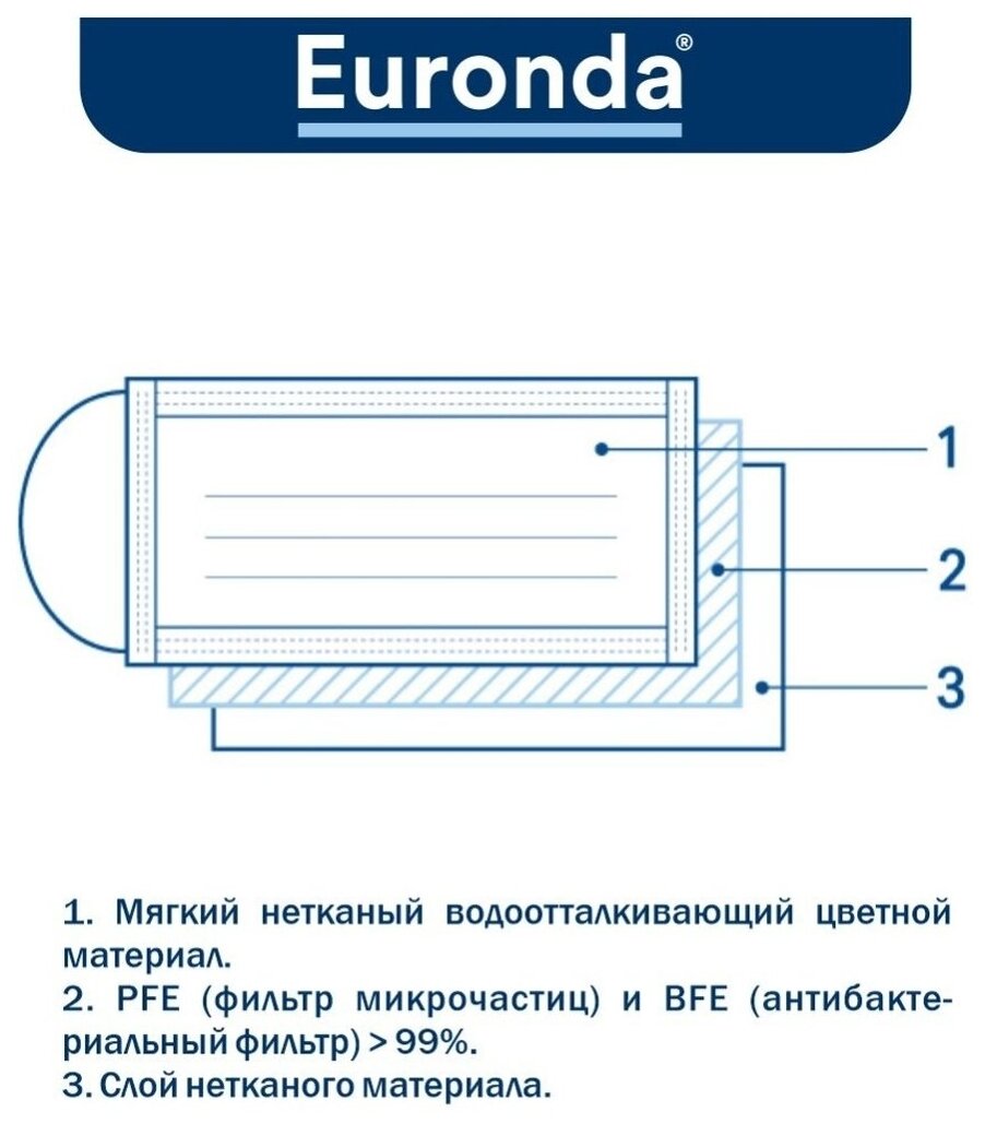 Маска медицинская Euronda ( Еуронда / Евронда ) Monoart трехслойная - голубой, 50 шт. в упаковке