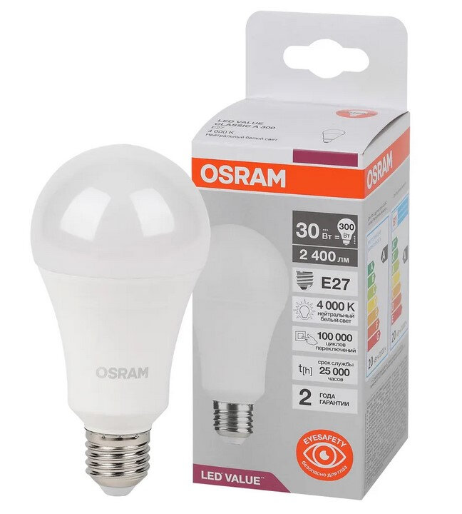 Отзывы на Лампа светодиодная LVCLA250 30SW/840 230VFR Value 30Вт 4000К нейтр. бел. E27 2400лм колба A угол пучка 180град. 220-240В (замена 300Вт) матов. пластик OSRAM 4058075696778 LEDVANCE
