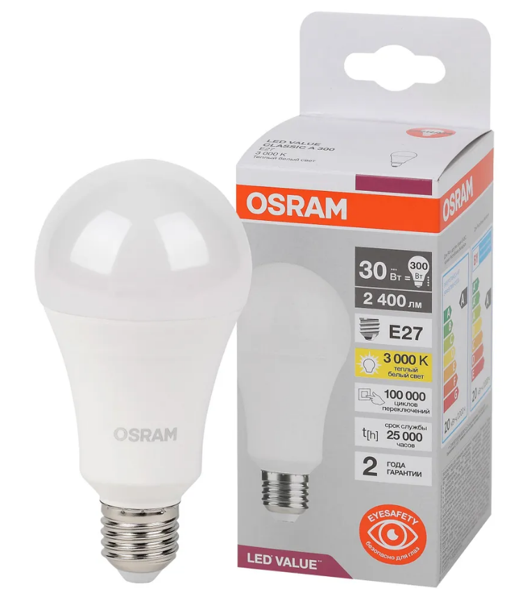 Отзывы на Лампа светодиодная LVCLA250 30SW/830 230VFR Value 30Вт 3000К тепл. бел. E27 2400лм колба A угол пучка 180град. 220-240В (замена 300Вт) матов. пластик OSRAM 4058075696594 LEDVANCE