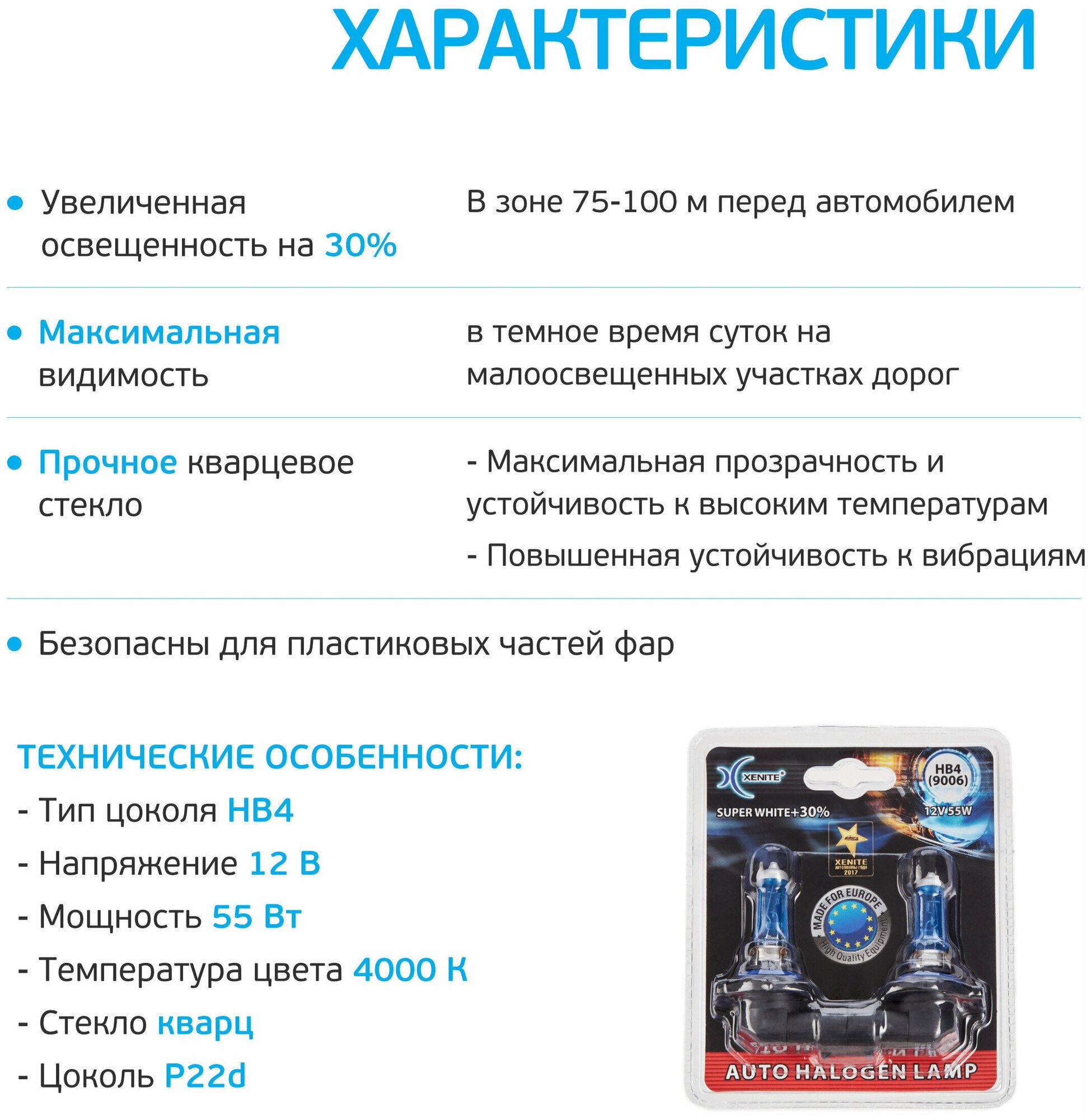 XENITE 1007041 Галогенные лампы (12V) HB4 (9006) (SUPER WHITE+30) (блистер 2 шт.) информация: