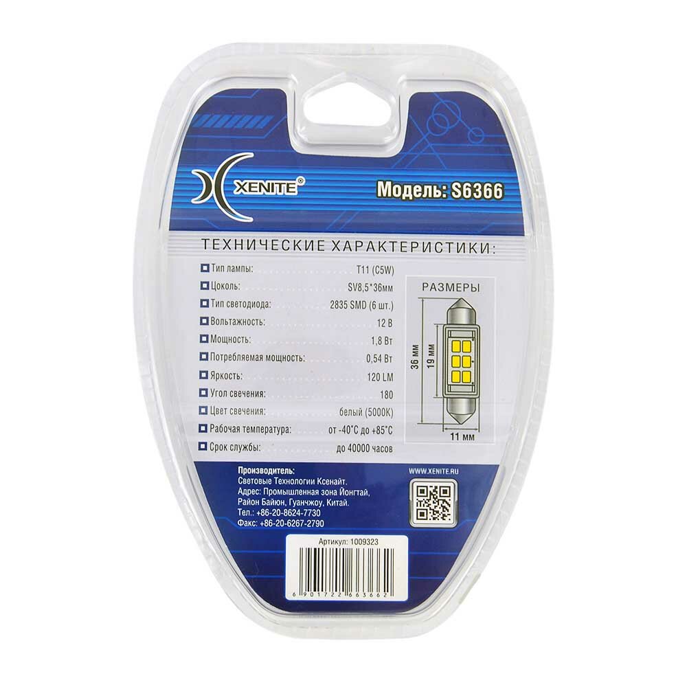 Лампа светодиод 12v sv8.5 т11х36 xenite s6366 6smd 66lm белая 2шт