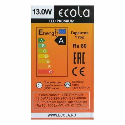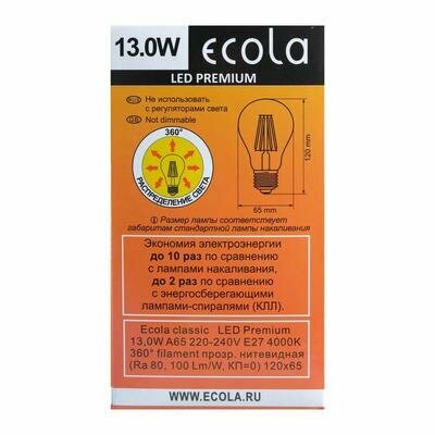 Лампа светодиодная Ecola classic Premium, Е27, А65, 13 Вт, 4000 К, 360°, 220 В, филаментная информация:
