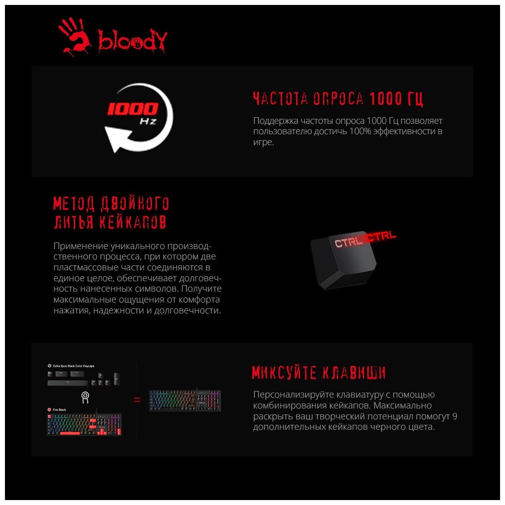 Игровая клавиатура Bloody, черный, кириллица+QWERTY, с подсветкой, мембранная