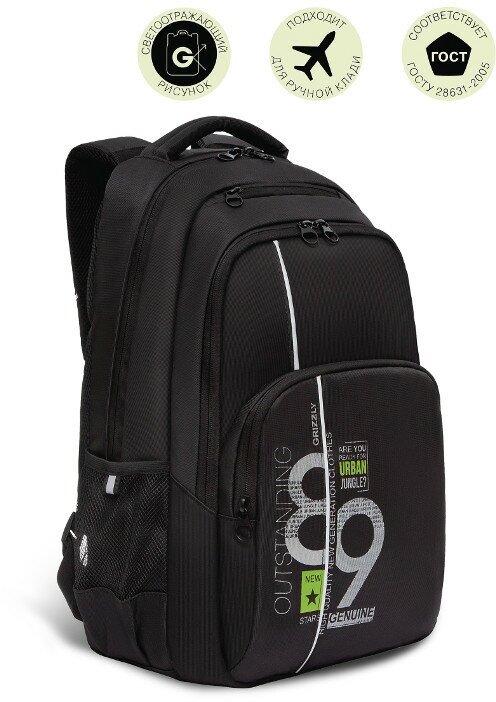 Рюкзак Grizzly RU-230-6 черный-салатовый, 2отделения, карманы, анатомическая спинка, 32 х 45 х 23 информация: