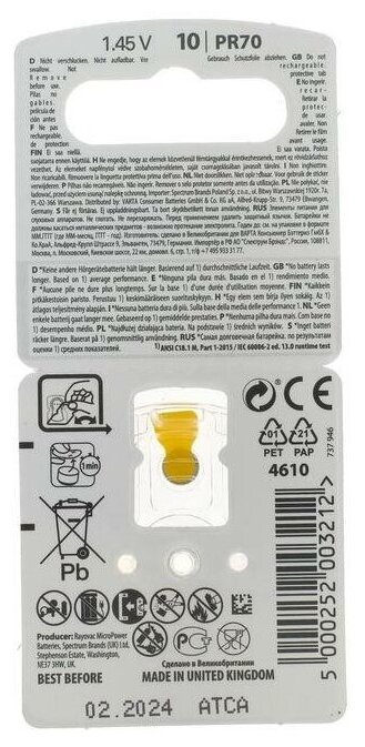 Батарейки Rayovac 10 (PR70) для слуховых аппаратов, 1 блистер (6 батареек)