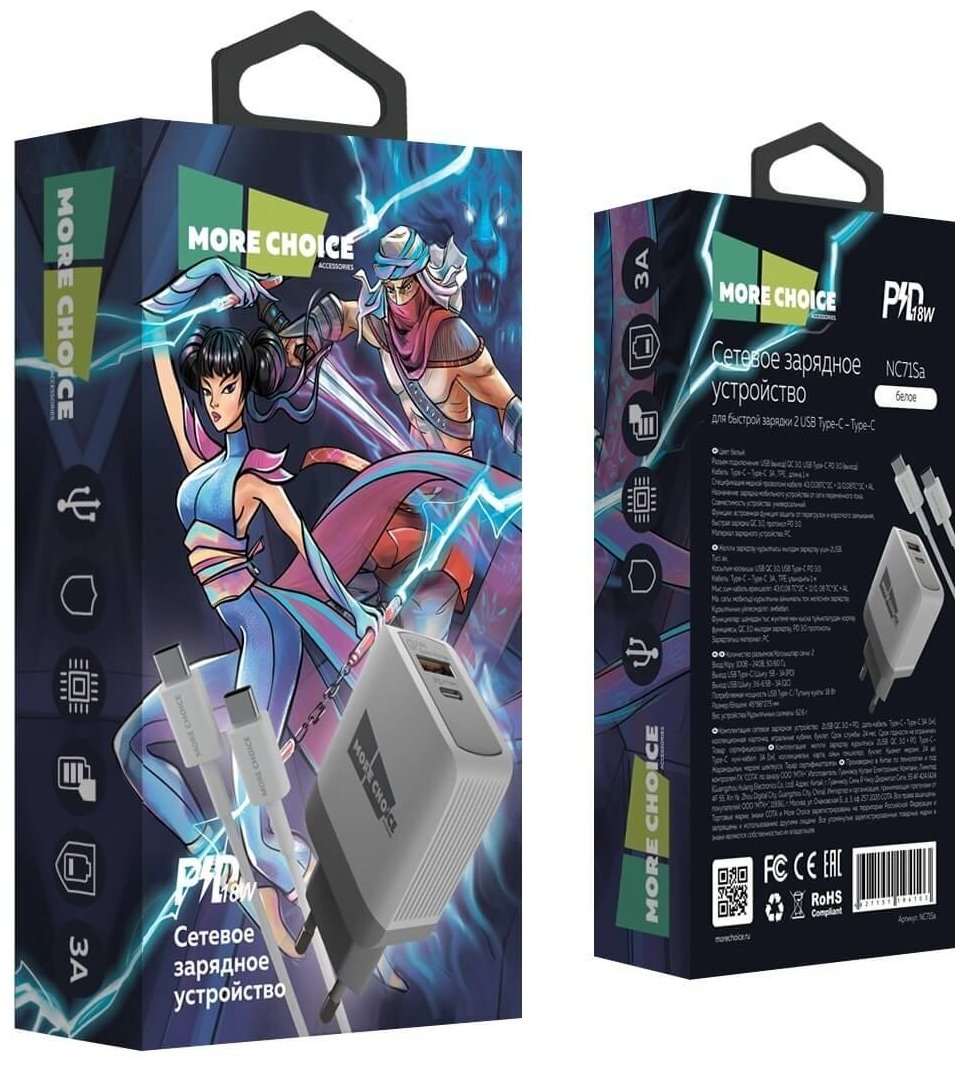 СЗУ More choice NC71Sa для быстрой зарядки 2USB 3.0A QC 3.0 + PD NC71Sa для Type-C Type-C белый информация: