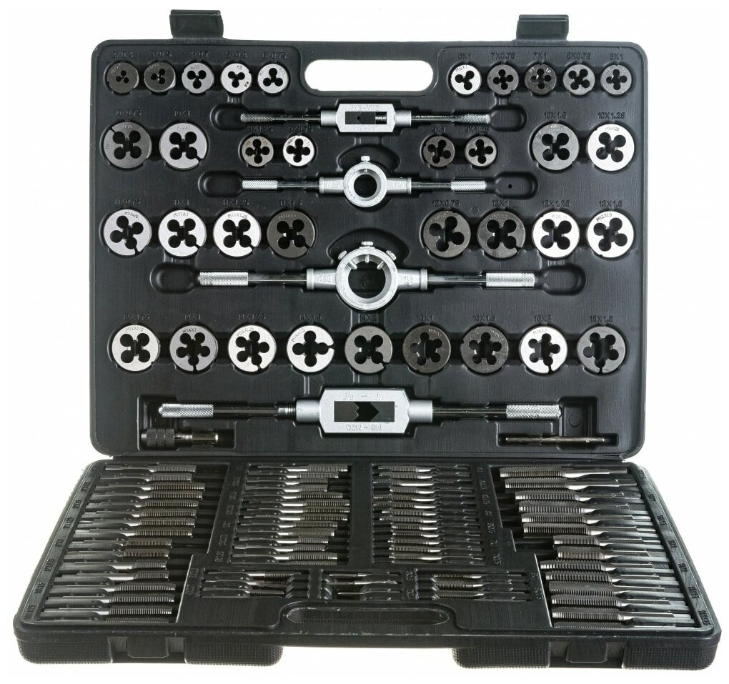 | Подробная комплектация | - 35 плашек и 35 метчиков комплектных из 2 штук: M2x0.4, M3x0.5, M4x0.7, M5x0.8, M6x0.75, M6x1.0, M7x0.75, M7x1.0, M8x0.75, M8x1.0, M8x1.25, M9x0.75, M9x1.0, M9x1.25, M10x0.75, M10x1.0, M10x1.25, M10x1.5, M11x0.75, M11x1.0, M11x1.25, M11x1.5, M12x0.75, M12x1.0, M12x1.25, M12x1.5, M12x1.75, M14x1.0, M14x1.25, M14x1.5, M14x2.0, M16x1.0, M16x1.5, M16x2.0, M18x1.5; - 2 метчикодержателя: M3-M12, M6-M20; - 2 плашкодержателя: ⌀25мм, ⌀32мм; - метчикодержатель Т-образный M3 - M6. |