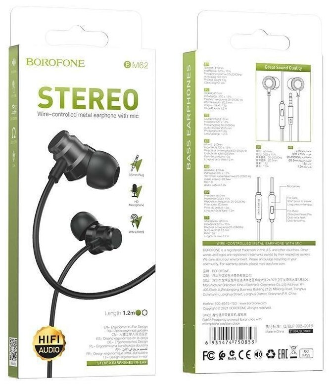 Наушники внутриканальные Borofone BM62, Prosperity, пластик, алюминий, кабель 1.2м, цвет: чёрный