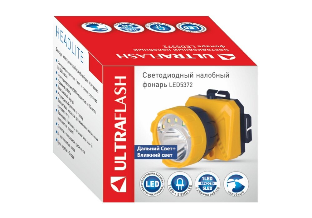 Фонарь налобный LED 5372 (5SMD + 1Вт 2 режима; желт./черн.) Ultraflash ULTRAFLASH 12416 (1 шт.)