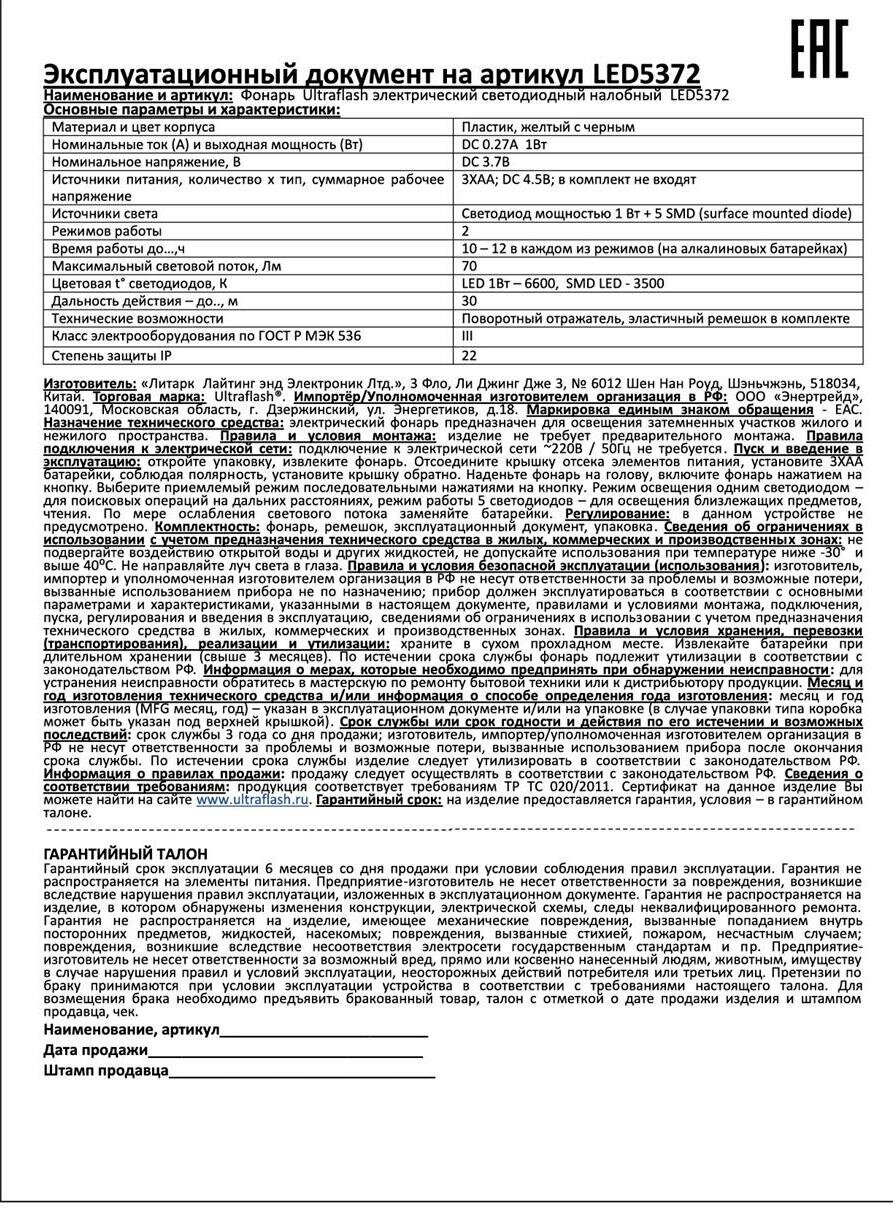 | Подробная комплектация | - фонарь; - ремешок. |
