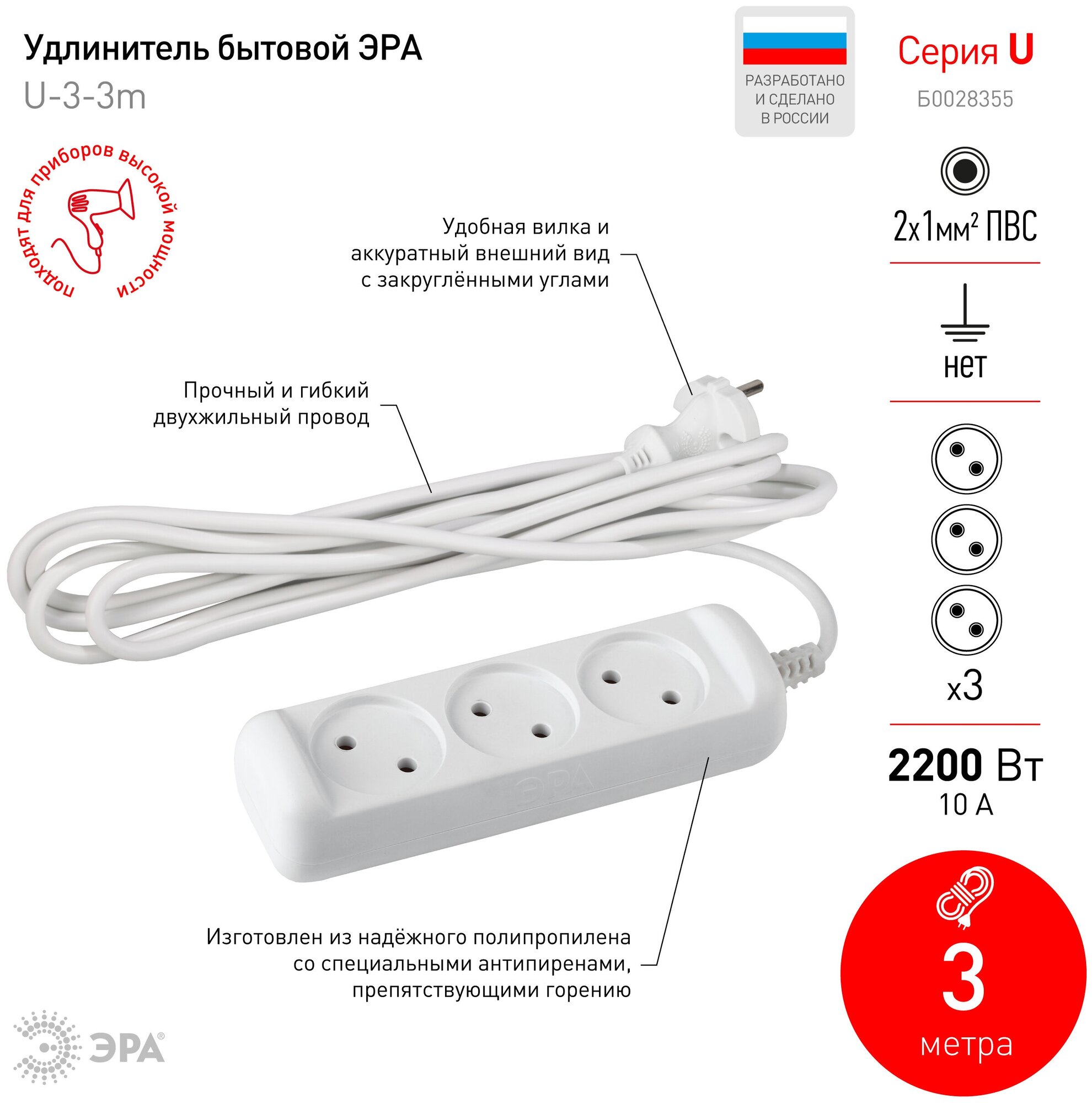 10 цен на Удлинитель ЭРА U-3-3m, без заземления, 3 розетки, 3 м, 10А