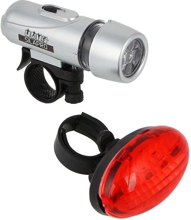 Аксессуар для велосипедов (SILAPRO Набор фонарей 2шт: задний (7,5х4х3,5см, 3LED, 2хААА) + передний (10х3,5х3,5см, 5LED, 4хААА))