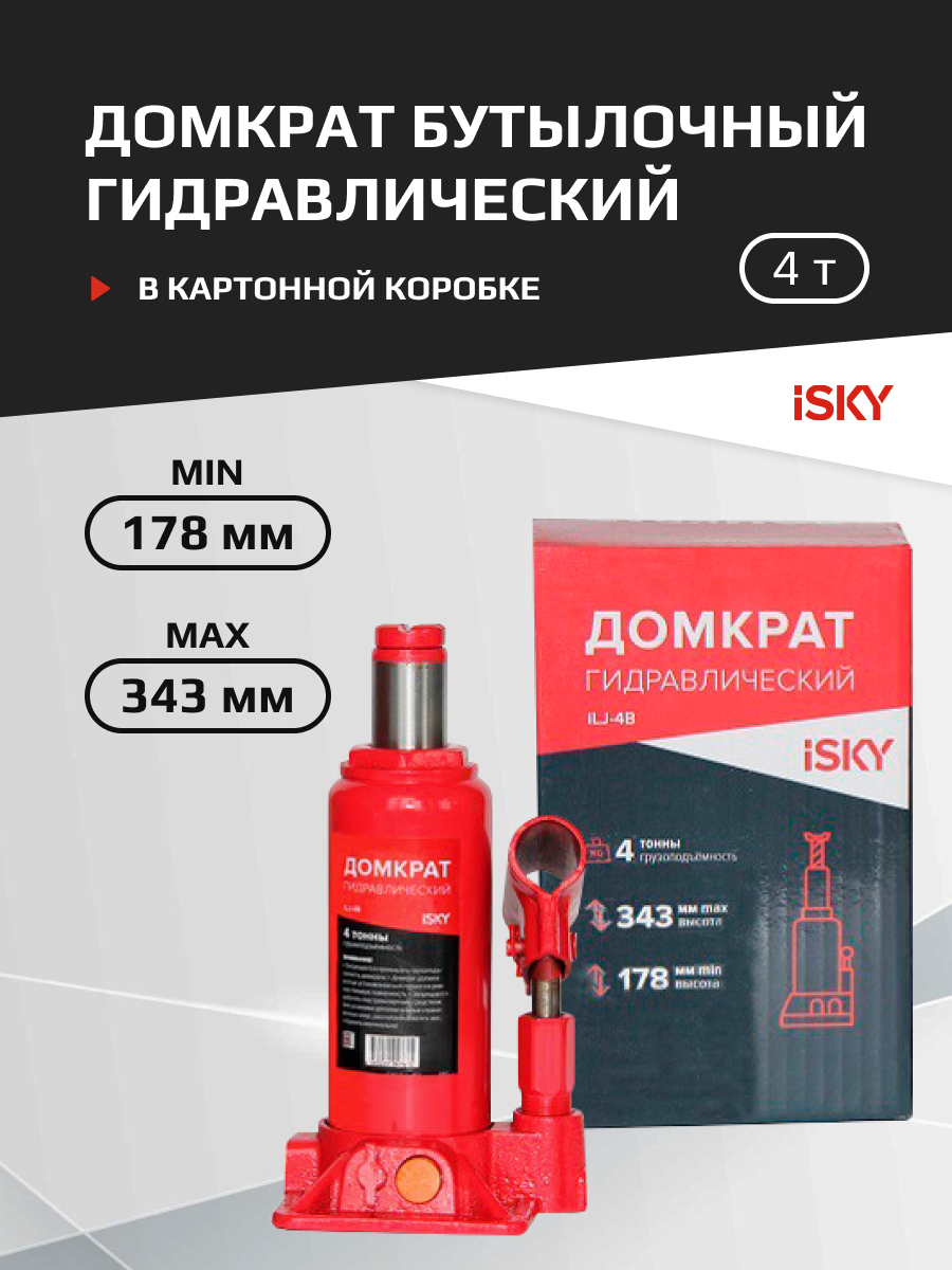 Домкрат бутылочный гидравлический iSky, 4 т, от 178 до 343 мм, в картонной коробке ISKY ILJ4B | цена за 1 шт