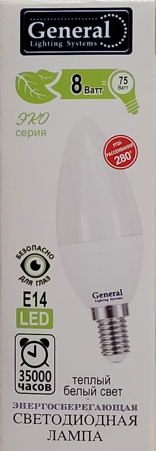 Отзывы на Светодиодная LED лампа свеча General Lighting E14(е14) 8W (Вт) 2700K 680lm 35x105 220V матовая GLDEN-CF-8-230-E14-2700 638200