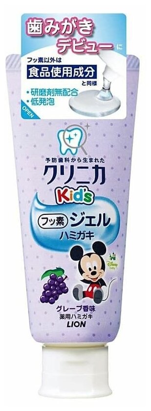 Зубная паста детская Lion Япония Clinica Kid's Gel с фтором, без абразива, виноград, 60 г