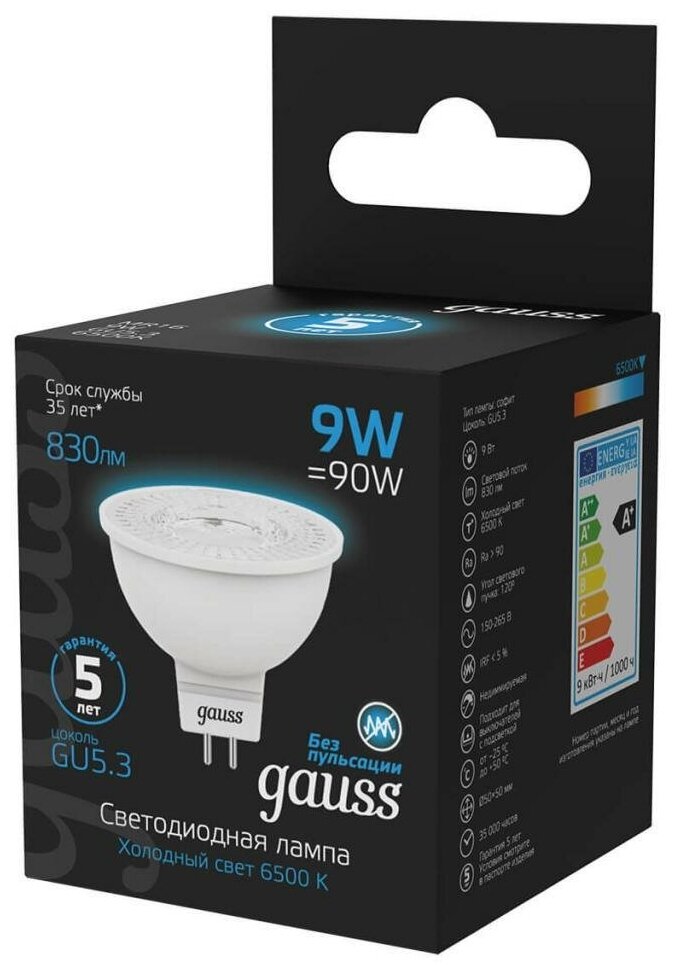 Лампа GAUSS MR16 9W 830lm 6500K GU5.3 LED 1/10/100 101505309 информация: