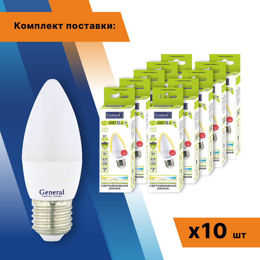 10 цен на Светодиодная лампа General свеча C37 E27 12W 2700K 2K 35х105 пластик/алюм GLDEN-CF-12-230-E27-2700 661092