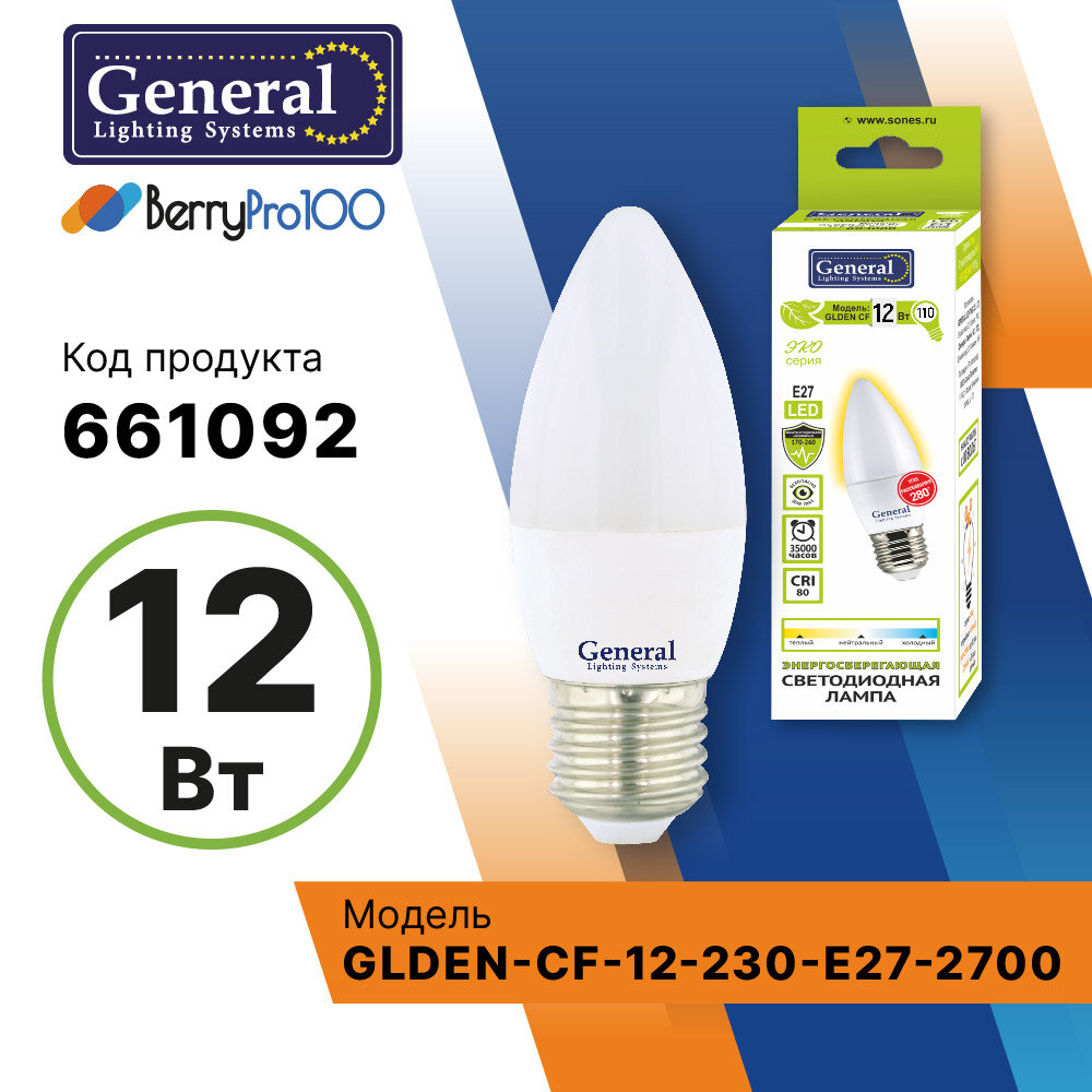 Лампочка светодиодная 12 Вт 661092, General GLDEN-CF-12-230-E27-2700