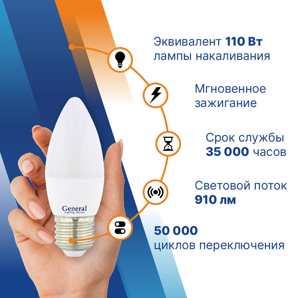 Отзывы на Светодиодная лампа General свеча C37 E27 12W 2700K 2K 35х105 пластик/алюм GLDEN-CF-12-230-E27-2700 661092