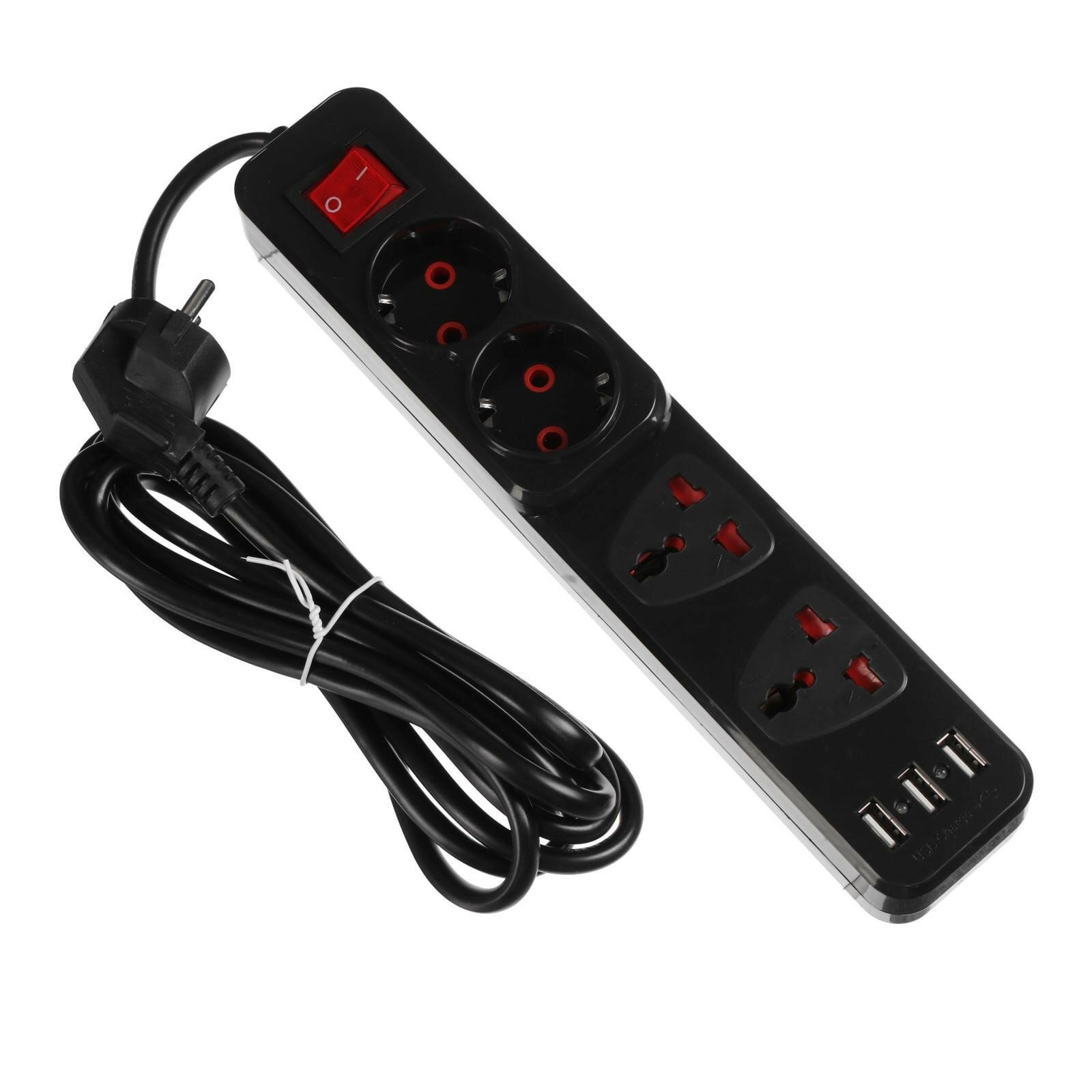 Удлинитель Luazon Lighting, 2 евро+2 унив.роз., 3 м,2200Вт, 2х0.75 мм2, 3хUSB, с выключателем, чёрный информация: