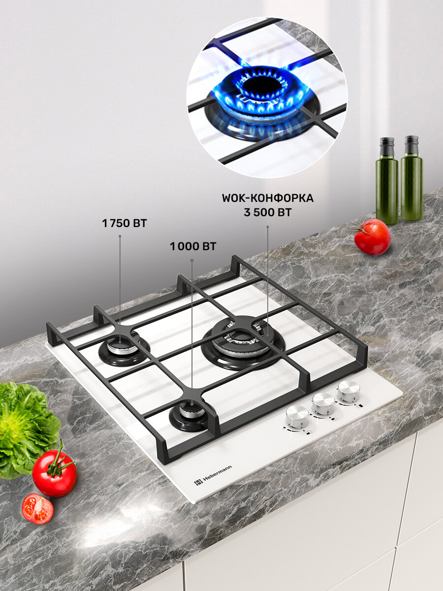 Отзывы на Варочная панель газовая Hebermann HBGG 453.1 W,ширина 45 см, закаленное стекло, 3 конфорки, 6250 Вт