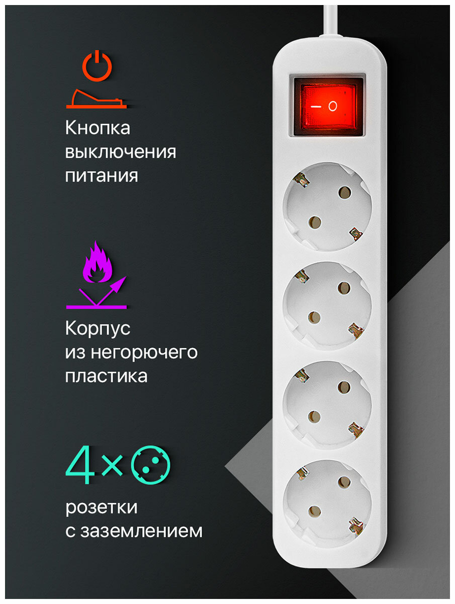 Удлинитель Defender S450, 4 розетки, с заземлением, выключатель, 5м, белый (арт. 262244)