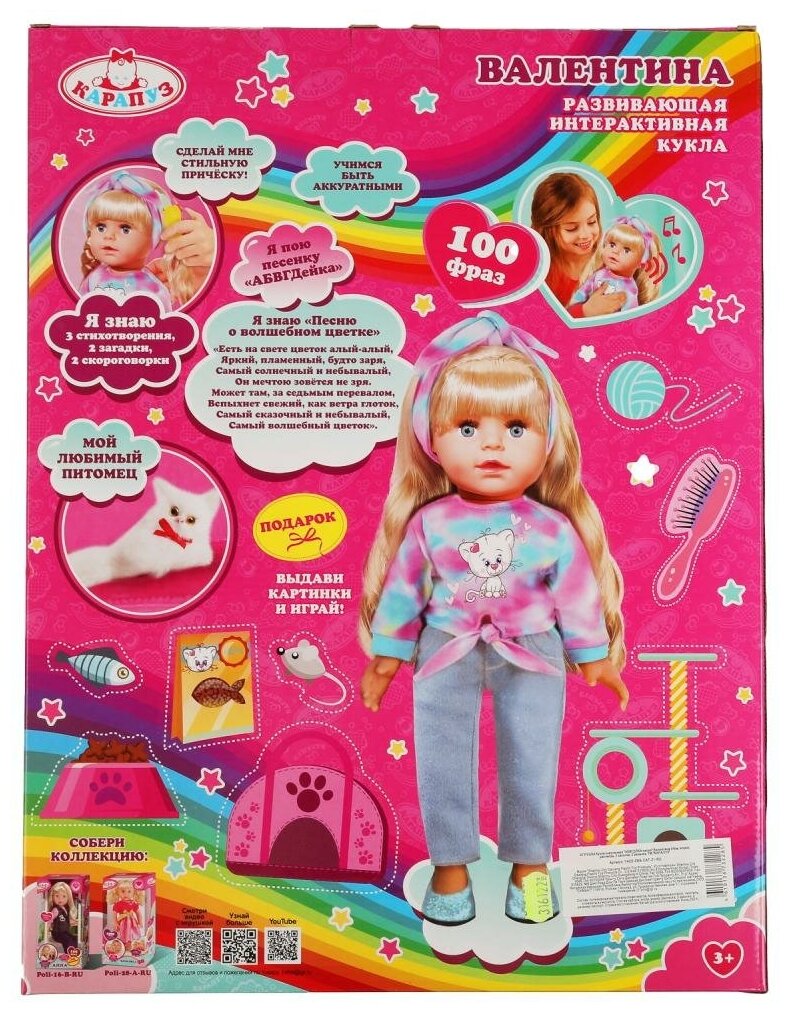 Карапуз Кукла озвученная АБВГДЕЙКА песня Валентина 40см, игрушка кошка, 6 акс карапуз в кор.12шт