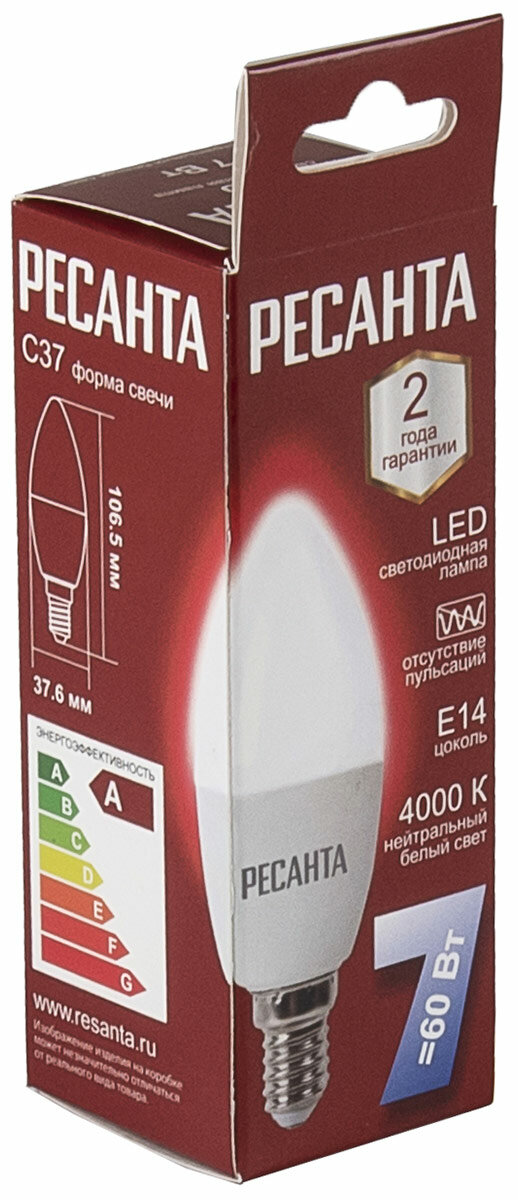 Лампа Ресанта LL-R-C37-7W-230-4K-E14 (свеча, 7Вт, нейтр., Е14) белый информация:
