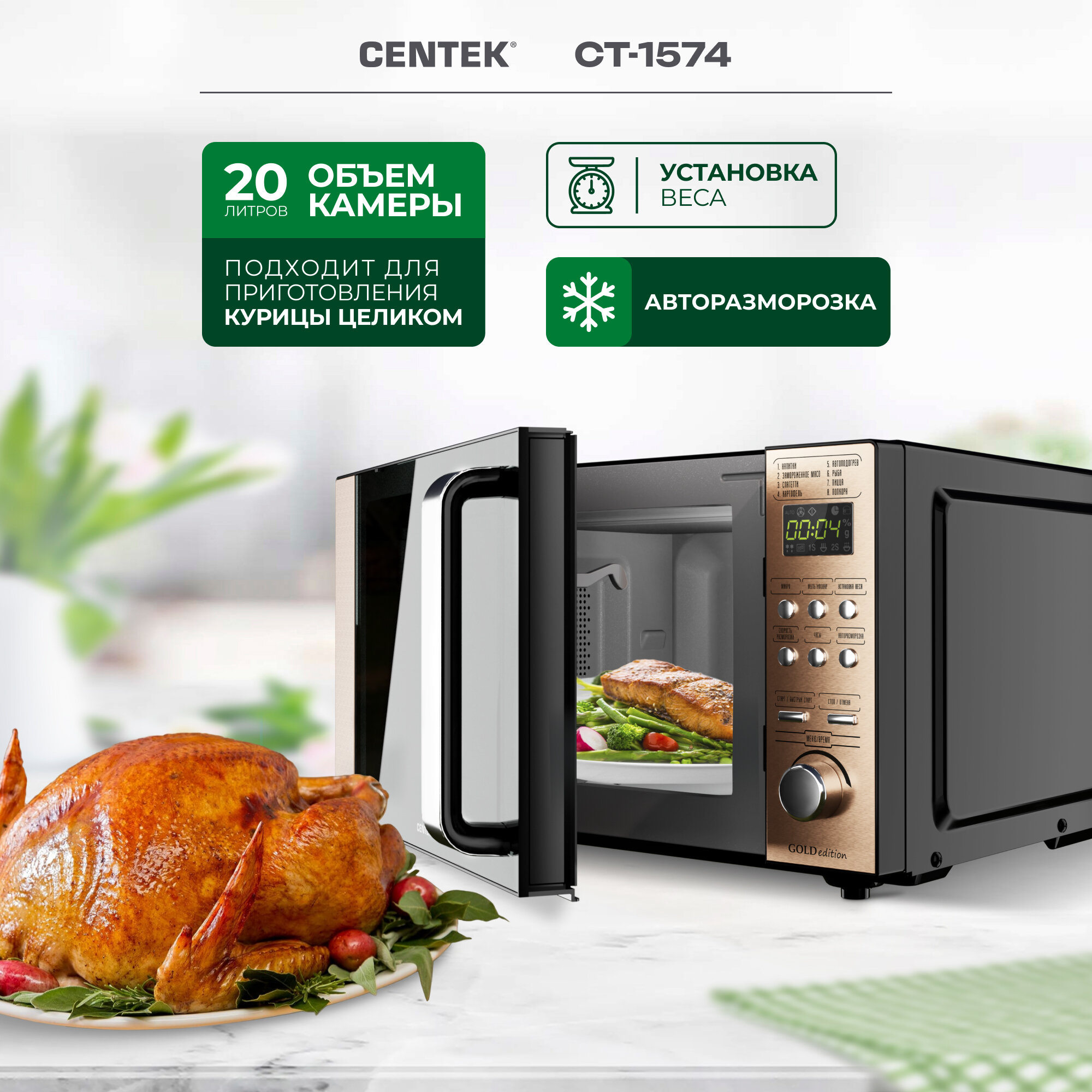 Микроволновая печь CENTEK CT-1574 Золотой 20л, 700W, 6 уровней мощности информация: