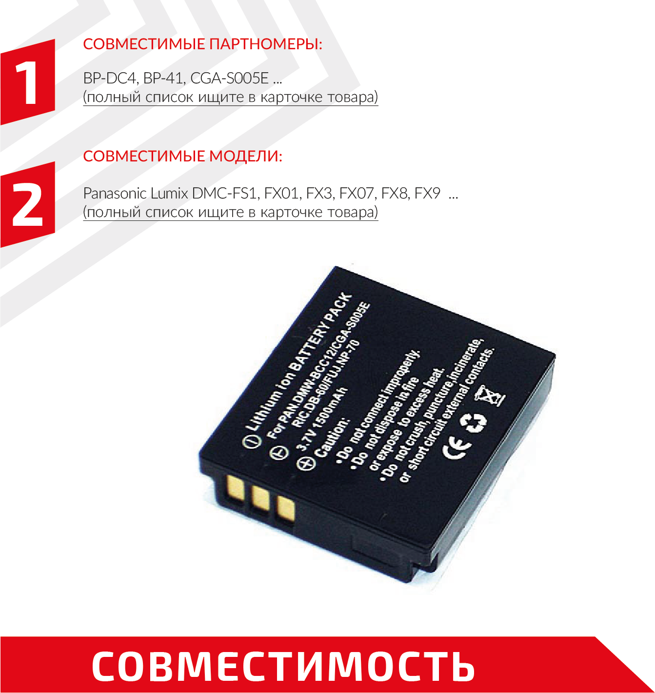 | Совместимость | FujiFilm FinePix F20, F40, F45, F47, Leica C-Lux 1, D-Lux 2, 3, 4, Panasonic Lumix DMC-FS1, FX01, FX3, FX07, FX8, FX9, FX10, FX12, FX50, LX1, LX2, LX3, Pentax Optio X90, Ricoh WG-M1, Samsung HMX-R10, Sigma DP1, DP2, DP3 Merrill, BP-41, BP-DC4, BP-DC4-E, BP-DC4-J, BP-DC4-U, CGA-S005, CGA-S005A, CGA-S005A/1B, CGA-S005E, CGA-S005E/1B, D-Li106, DB-60, DMW-BCC12, IA-BH125C, NP-70 (FujiFilm) |