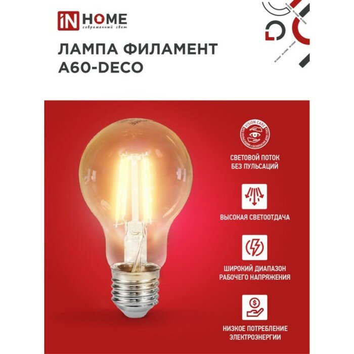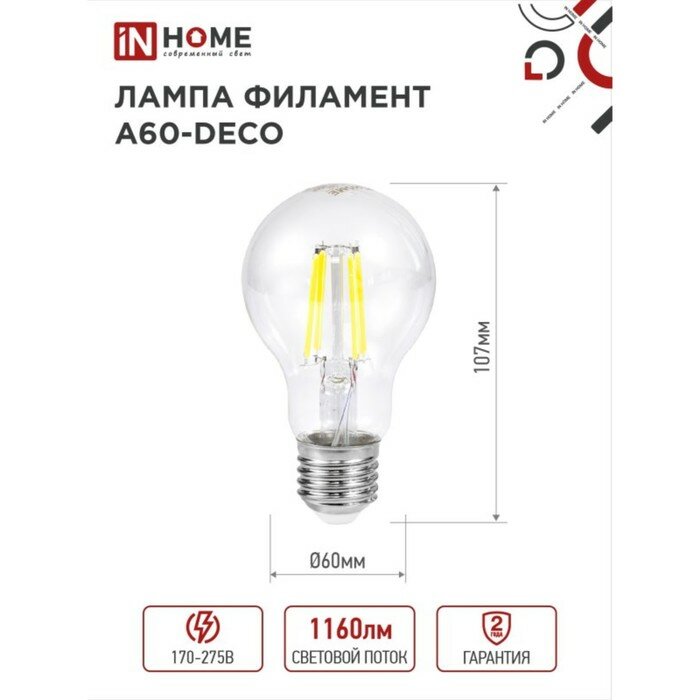 Лампа светодиодная IN HOME LED-A60-deco, 11 Вт, 230 В, Е27, 6500 К, 1160 Лм, прозрачная информация:
