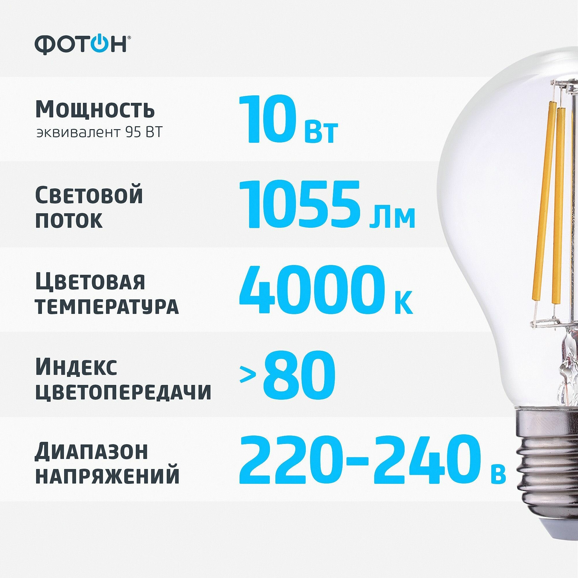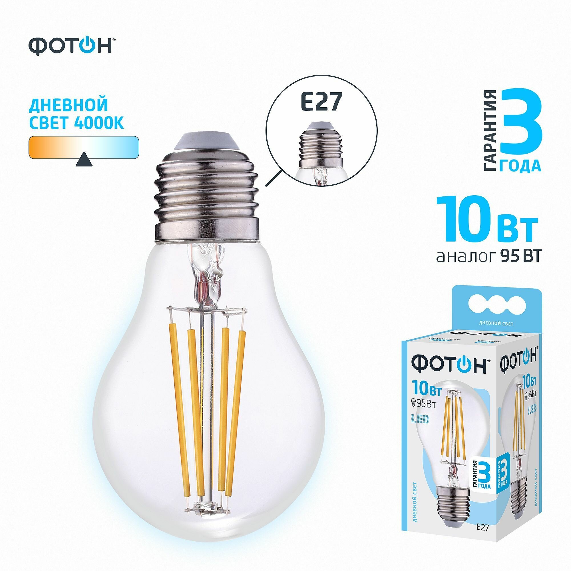 Отзывы на Фотон Лампа светодиодная филаментная LED FL A60 10W E27 4000K 23986