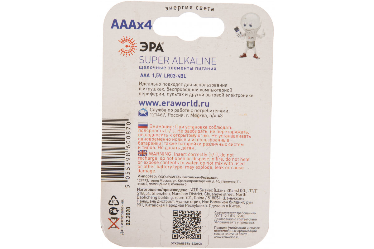 Элемент питания LR03 (ААА) алкалиновый бл. 4шт ЭРА информация: