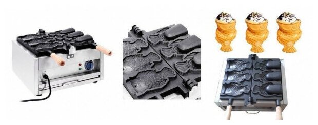 | Дополнительная информация | предназначена для приготовления полых вафель в виде рыбок (стаканчики); такие вафли используются предприятиями общественного питания для наполнения их, например, мороженным или кремом; одновременно выпекает 3 рыбки |