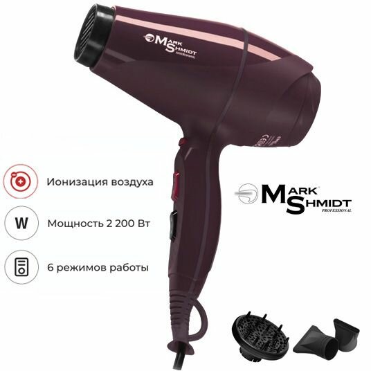 Фен Mark Shmidt Compact портвейн, ionic, ceramic, 2 насадки + диффузор 2200W