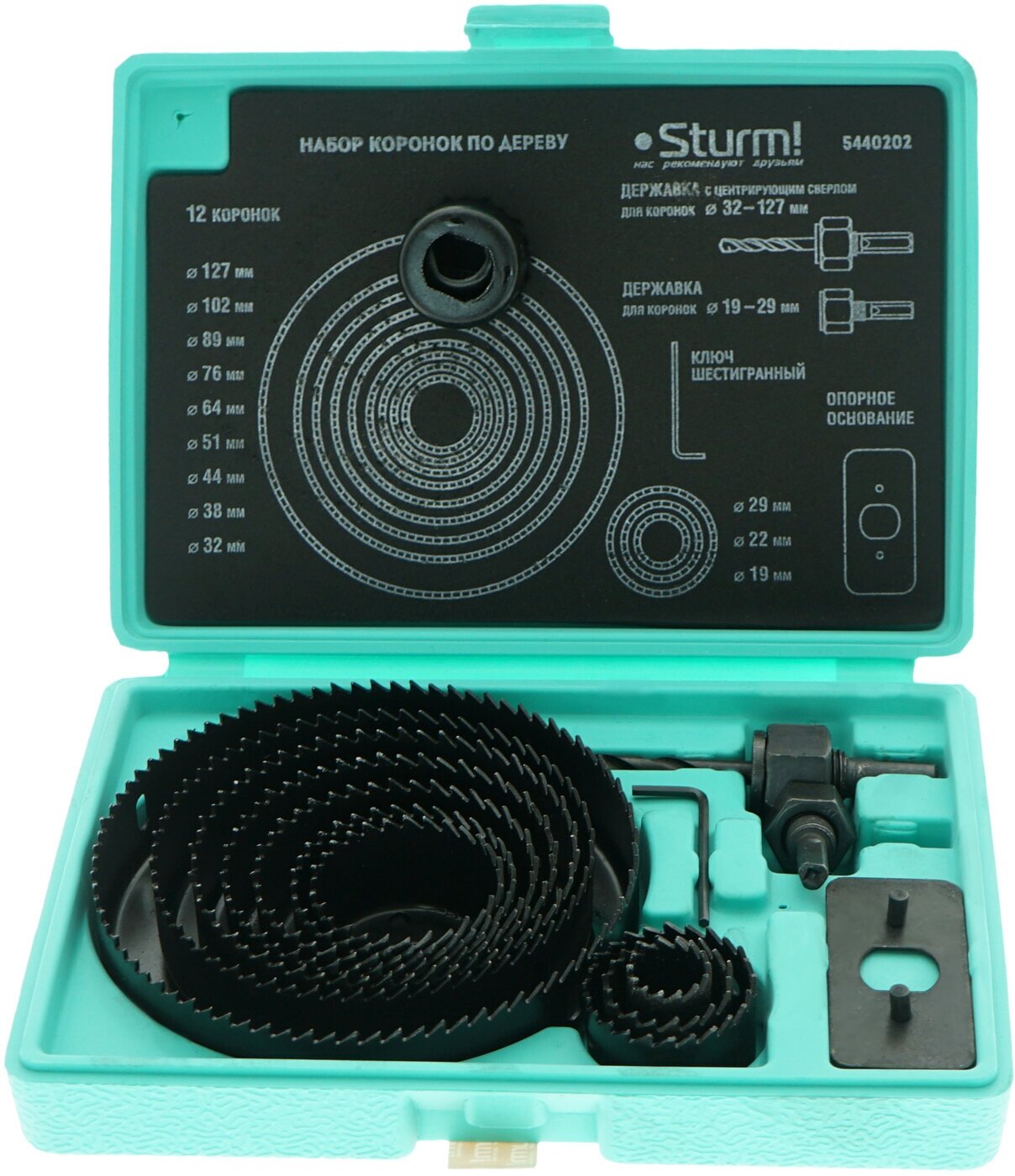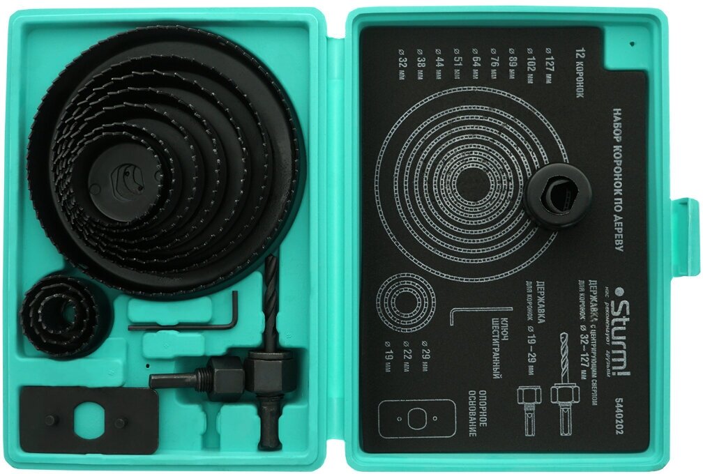 5440202 Коронки по дереву набор 15ед d=19/22/29/32/38/44/51/64/76/89/102/127мм, кейс, Sturm!