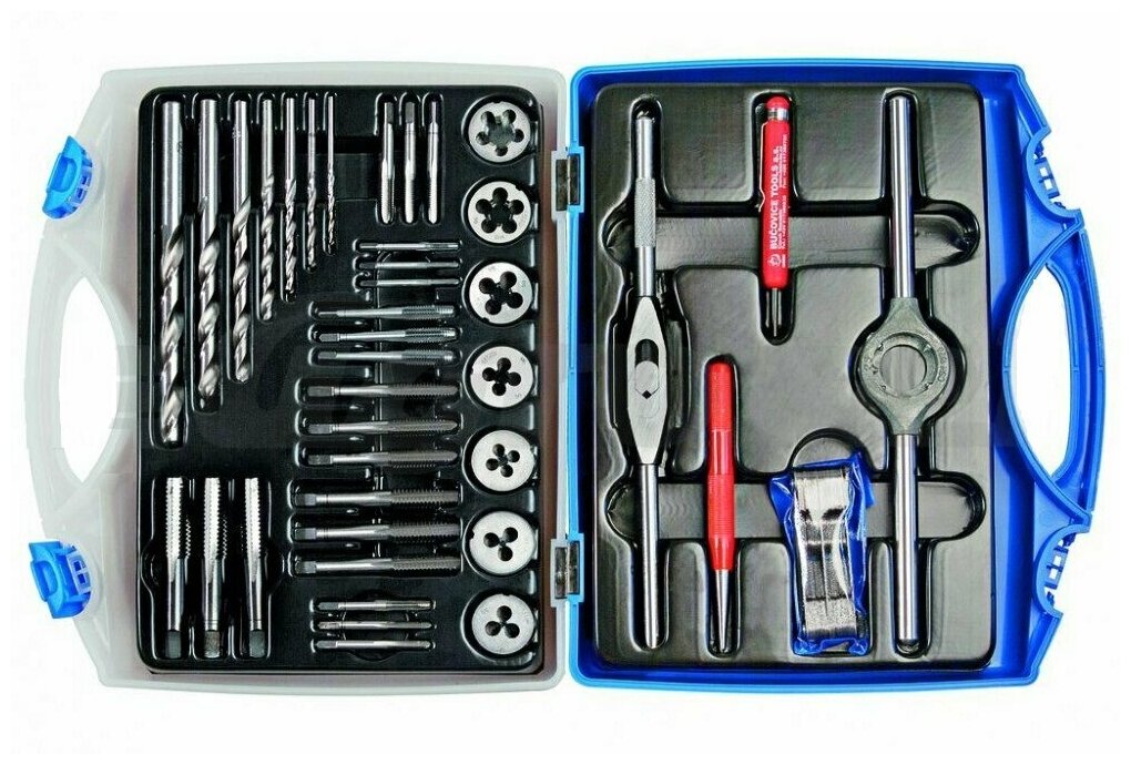 Резьбонарезной набор M 3, 39 пр, M3-M12, метчики+плашки+воротки+сверла+резьбомер+керн+отвертка в пластиковом кейсе Bucovice Tools 330120