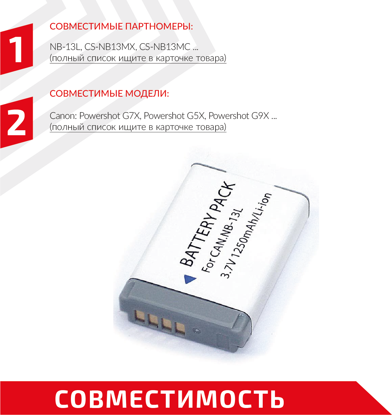 Отзывы на Аккумулятор (АКБ, аккумуляторная батарея) NB-13L для фотоаппарата Canon PowerShot G5 X, 3.7В, 1250мАч, Li-ion