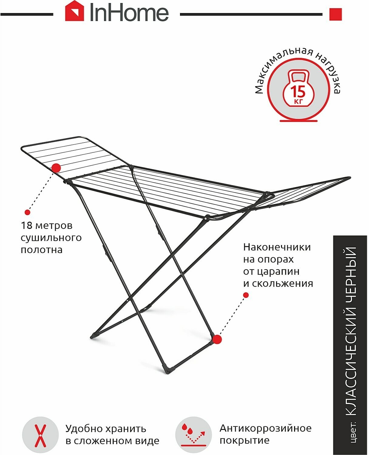 Сушилка для белья InHome напольная раскладная,181x54х108 см, 18 м черная INCD1/1 . информация: