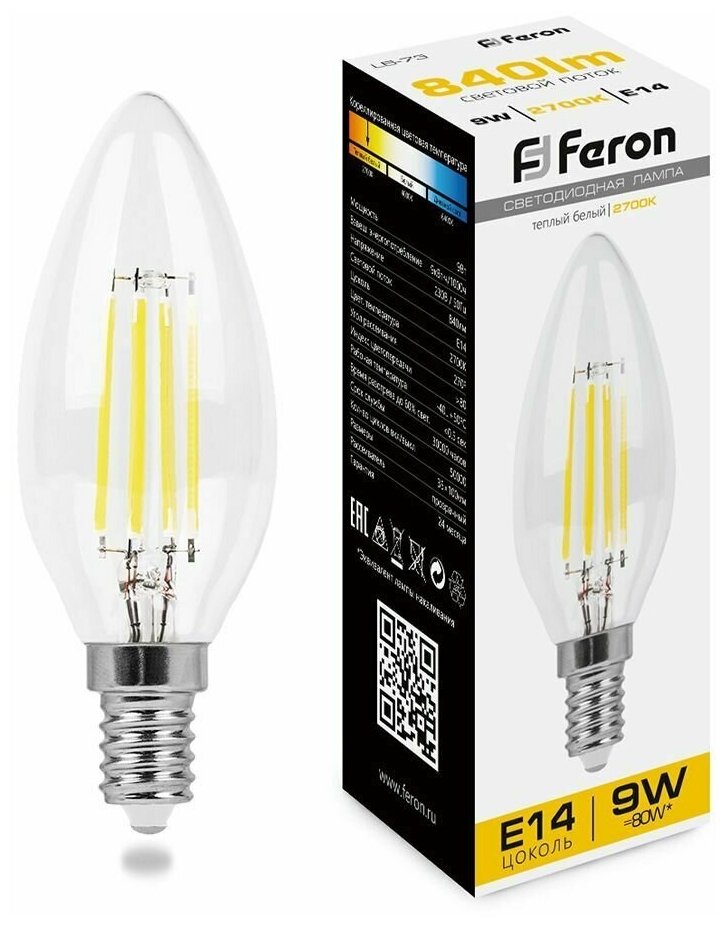Лампочка светодиодная свеча E14/C35 9Вт 840Лм белый теплый 2700К информация: