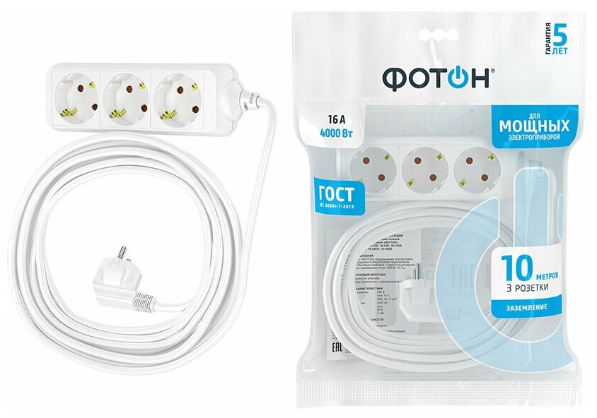10 цен на Фотон сет. удл. ПВС 3х1 3 роз. 10 м 16А белый, земля (корпус-PP,UV,ударопроч.,негорюч) 16-103Е 11853 (арт. 17836)