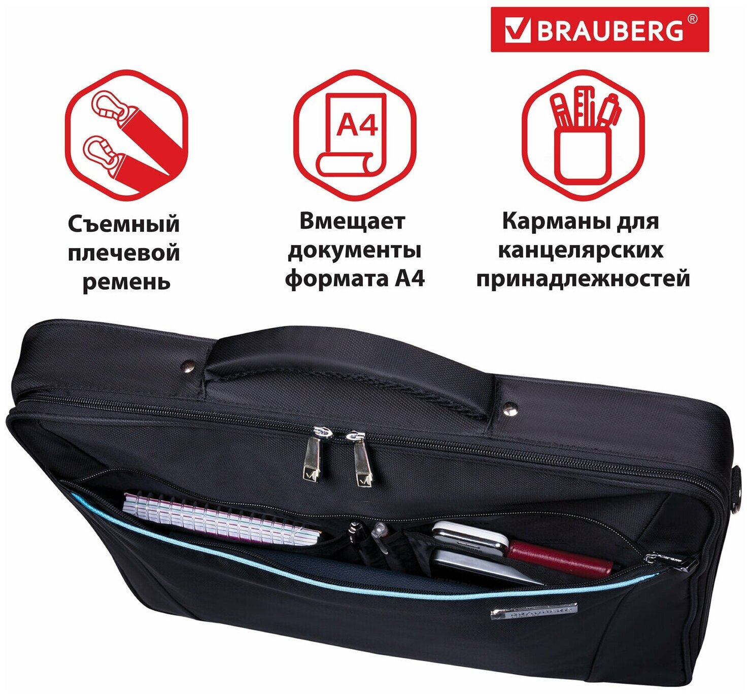 Сумка портфель BRAUBERG PRACTICAL с отделением для ноутбука 15,6", Blue line, черная, 29х40х7 см, 272603