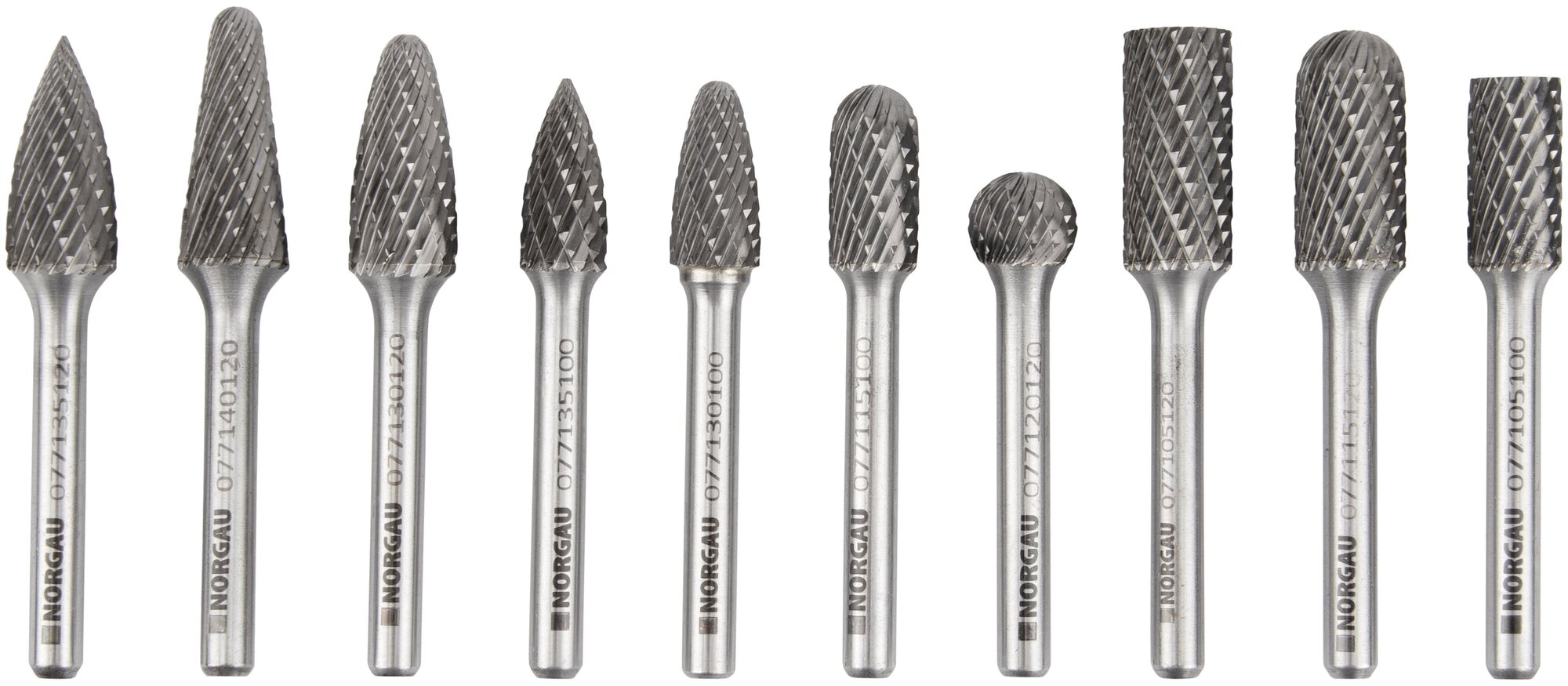 Набор твердосплавных борфрез NORGAU Industrial, форма A/B/C/D/E/F/G/H/L/M, режущие головки 12 мм, 10 предметов