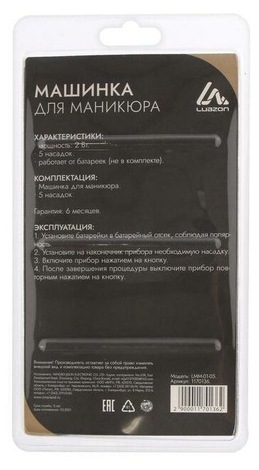 Luazon Home Аппарат для маникюра Luazon LMM-01-05, 5 насадок, 2 Вт, 2хAA (не в комплекте), белый информация: