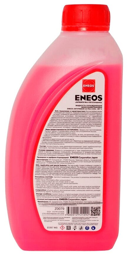 ENEOS Z0079 Антифриз G12+ ENEOS Ultra Cool готовый 1кг -40°С розовый
