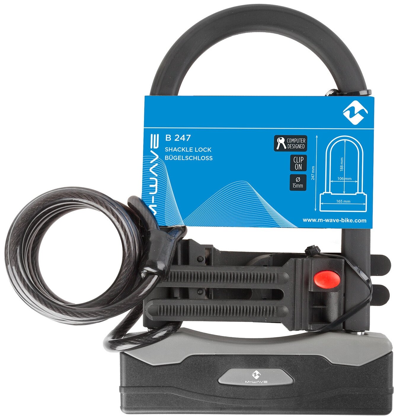 Замок 5-234025 скоба вело/универсальный U-образный 165х247мм квадратное сечения пруток 15мм с тросом 8х1800мм, с крепежом к раме M-WAVE