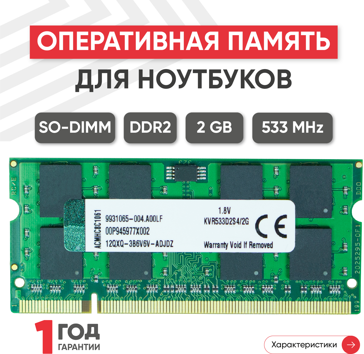 Модуль памяти Kingston SODIMM DDR2, 2ГБ, 533МГц, PC2-4200 информация: