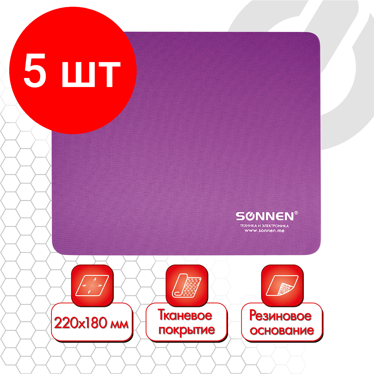 Коврик для мыши SONNEN "PURPLE" резина + ткань 220х180х3 мм, 5 шт информация: